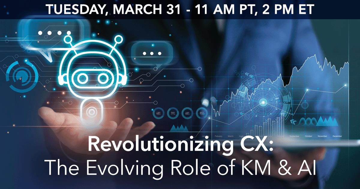 Don't miss this live event on Tuesday, March 31st, 11:00 AM PT / 2:00 PM ET.  Register Now to attend the webinar Revolutionizing CX: The Evolving Role of KM & AI.