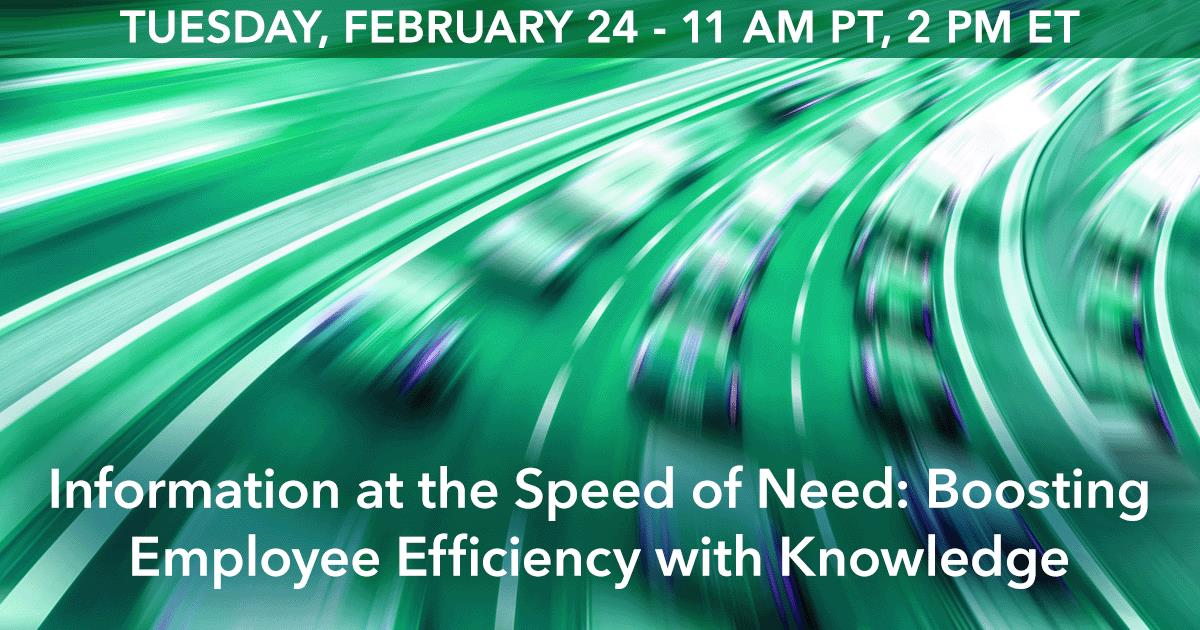 Don't miss this live event on Tuesday, February 24th, 11:00 AM PT / 2:00 PM ET.  Register Now to attend the webinar Information at the Speed of Need: Boosting Employee Efficiency with Knowledge.